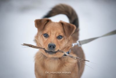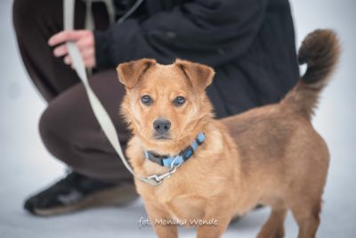 Tymek to jednak nie tylko żywioł. Po chwili szaleństw potrafi wtulić się w opiekuna, spokojnie odpoczywać obok i czerpać szczęście z samej obecności bliskiej osoby. To piesek, który naprawdę chce być częścią rodziny – towarzyszyć w codziennych sprawach, leżeć przy kanapie, patrzeć w oczy i ufać.